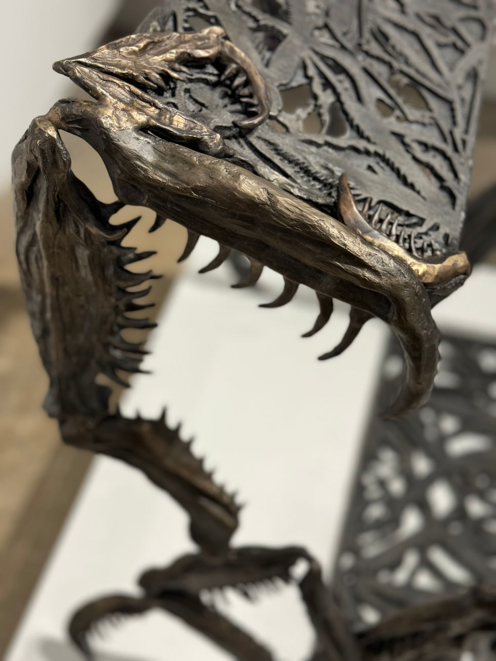Molting out of the religious influences of my childhood, I use metals to create new forms of permanence focusing instead on my reverence for nature. This work recrafts artifacts from an institution of control; contorting insect limbs into a monument asking for coalescence with organic life outside of human dominion. Locusts are not a species but a phenomenon; environmental instability and lack of resources pressures individual grasshoppers into a gregarious phase, it is then that they exhibit phenotypic plasticity and undergo biological shift in anatomy and psychology, the individual to a part of the swarm. Peril is not born, it is created. The grasshopper is not a threat as a lone unit and yet the locust swarm incomprehensibly outnumbers the individual and challenges human notions of independence; destabilizing the fantasy of the individualized soul and of free will.